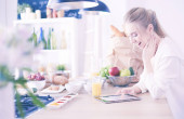 piękna młoda kobieta za pomocą tabletu cyfrowego w kuchni
