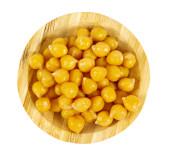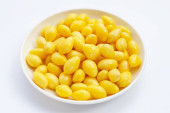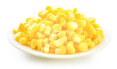 Kukurydza cukrowa w puszce z gałką masła w białej ceramicznej misce