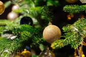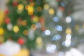 Święta Bożego Narodzenia i Nowy Rok koncepcji wakacji. Zbliżenie i rozmycie dekoracji choinki z wstążkami kulki i ozdoby na białej cegły ściany i bokeh