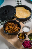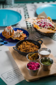 Madryt, Hiszpania - 20 września 2019: Prawdziwe meksykańskie żeberka i napoje. Autentyczny meksykański stół w ładnej restauracji.