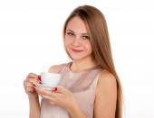 atrakcyjna młoda kobieta w sukni szary biznesu. posiada żółte
