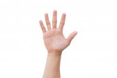 Mężczyzna ręka pokazuje pięć palców odizolowanych na białym tle, miejsce na tekst