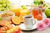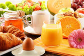 śniadanie: kawa, sok pomarańczowy, rogalik, jajko, warzywa
