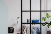 Suszone kwiaty i roślinność w nowoczesnym wnętrzu. Wystrój wnętrz w stylu eko z zielenią.