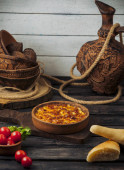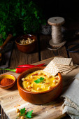 topiony ser na patelni garncarskiej podawany na desce do krojenia drewna