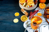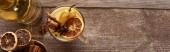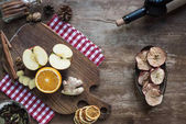 widok z góry kawałek ciasta i czerwonego przyprawionego grzanego wina z jagodami, anyżem, plasterkami pomarańczy i cynamonem na drewnianym rustykalnym stole