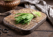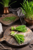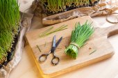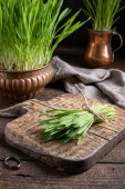 Świeżo uprawiana trawa jęczmienna na drewnianej desce