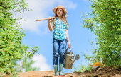 Moja praca jest moją pasją. Wiosenna wioska. Sezon letni. Mała dziewczynka z konewką. Dzień ziemi. ekologia środowiska. ochrona przyrody. farmerki pielęgnują rośliny. rolnictwo i rolnictwo