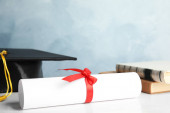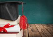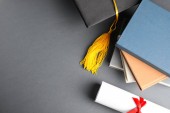 Kompozycja płaska z kapeluszem dyplomowym i dyplomem studenta na drewnianym stole, miejsce na tekst