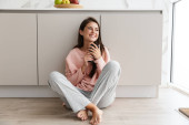 Piękna młoda dama w luźnych ubraniach degustacja pysznej czekolady siedząc na drewnianej podłodze w kuchni domowej.