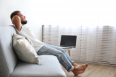 Zdjęcie "Kręcone włosy brunetka kobieta relaks na kanapie w domu." może być wykorzystywane do celów osobistych i komercyjnych zgodnie z warunkami zakupionej licencji Royalty-free. Obraz jest dostępny do pobrania w jakości wysokiej rozdzielczości do 5760x3840.
