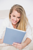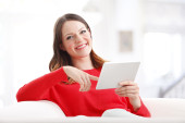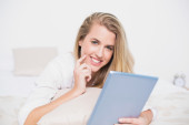 uśmiechnięta kobieta, leżąc w łóżku, przy użyciu tabletu