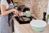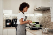 Zdjęcie "Mieszana kobieta rasy w fartuchu stojąca obok kuchenki i mieszająca sos pomidorowy. Na kuchence są rondel i garnek ze spaghetti." może być wykorzystywane do celów osobistych i komercyjnych zgodnie z warunkami zakupionej licencji Royalty-free. Obraz jest dostępny do pobrania w jakości wysokiej rozdzielczości do 5760x3840.