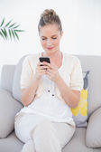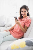 uśmiechający się dorywczo kobiety za pomocą jej smartphone