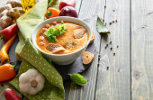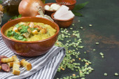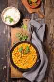 Pikantna zupa soczewicowa z chili, czosnkiem i cebulą na drewnianym stole