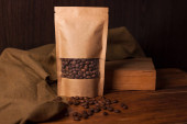 Brązowy worek papierowy Kraft torby z ziaren kawy widok z przodu na drewnianym tle.