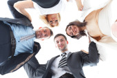 Grupa biznes stoi w rwetes, uśmiechnięty, niski kąt widzenia