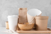 Ramka wykonana z ekologicznej jednorazowej zastawy stołowej. Kubki papierowe, naczynia, pojemniki szybkiej obsługi i bambusowe sztućce drewniane