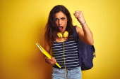 Piękna ruda studentka nosząca plecak i deskorolkę zirytowana i sfrustrowana krzykiem gniewu, szalona i wrzeszcząca podniesioną ręką, koncepcja gniewu