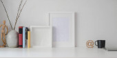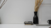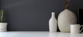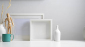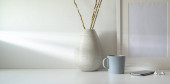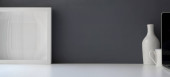 Nowoczesna przestrzeń robocza z ramą mocującą i ceramicznym wazonem na białym stole i szarym tle ściany z przestrzenią do kopiowania
