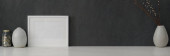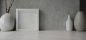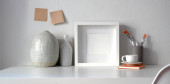 Nowoczesny obszar roboczy z przestrzenią do kopiowania i ceramicznym wazonem na białym stole i szarym tle ściany z przestrzenią do kopiowania