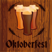 szklanka piwa w pobliżu małej beczki z kranem i kolcami pszenicy na drewnianym stole z napisem Oktoberfest