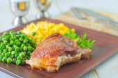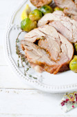 Filet z piersi kaczki strzyżonej z ziemniakami księżnej i brukselką, uroczysta kolacja na białym stole, widok z góry