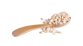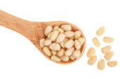 nasiona dyni w łyżce drzewnej izolowane na białym tle. pełna głębia ostrości