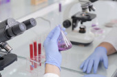młody samiec naukowiec patrząc przez mikroskop w a la