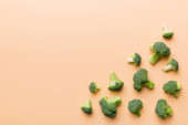 Kobieta trzyma jeden świeży zielony brokuły leżące na żółtym tle światła. Widok z góry.