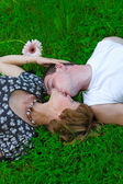 młody miłości para nastolatków leżącego na zielono