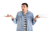 Zszokowany młodego człowieka na jasnym tle