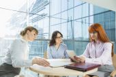 Biznesmeni Inteligentne Kobiety Spotkanie zespołu ds. pracy w sali konferencyjnej z papierami firmowymi w biurze.