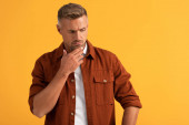 zdenerwowany mężczyzna zakrywając usta i patrząc na aparat odizolowany na pomarańczowy