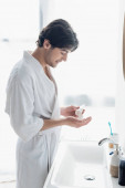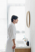 selektywny ostrość przystojny mężczyzna w wannie stojąc z filiżanki strony w pobliżu umywalka łazienka