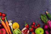 Asortyment świeżych warzyw organicznych. Jedzenie gotowanie kamienne tło. Zdrowe wegetariańskie (wegańskie) koncepcja jedzenia, widok z góry, płaskie leżaki.