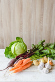 Asortyment świeżych warzyw organicznych. Jedzenie gotowanie kamienne tło. Składniki sałatki sałatkowej. Zdrowa wegetariańska (wegańska) koncepcja jedzenia, przestrzeń do kopiowania, widok z góry, płaski leżak.