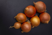 Olbrzymie cebulowe cebulki na kamiennym tle. Tło gotowania żywności, zbliżenie.