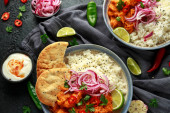 Bezmięsne curry z dyni z ryżem jaśminowym, marynowaną cebulą i chlebem naan