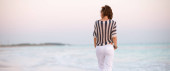 szczęśliwa stylowa kobieta na plaży o zachodzie słońca relaks