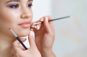 makijaż profesjonalny artysta stosując szminkę na ustach z ołówkiem