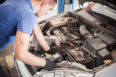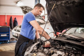 Mechanik wyładowuje olej silnikowy ze zbiornika silnika pod samochodem
