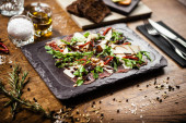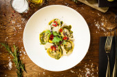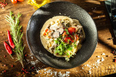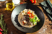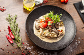 Black Angus Makaron serwowany w czarnej misce w restauracji