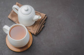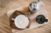 Filiżanka kawy z łyżeczką na drewnianym stole