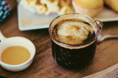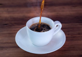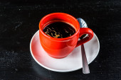 Filiżanka kawy z łyżeczką na drewnianym stole