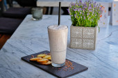 Karmel miętowy latte na drewnianym stojaku na stole