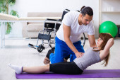 Fizjoterapeuta lub trener rozciągający starszą kobietę na macie do ćwiczeń w siłowni.