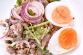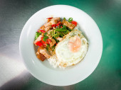 pikantne wymieszać smażony plasterek grillowanej wieprzowiny z chili i liści bazylii dolewki jaj na naczyniu