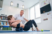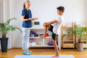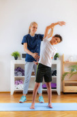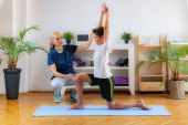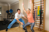 Fizjoterapeuta lub trener rozciągający starszą kobietę na macie do ćwiczeń w siłowni.