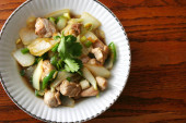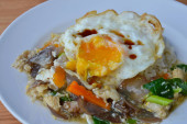pikantne wymieszać smażony plasterek grillowanej wieprzowiny z chili i liści bazylii dolewki jaj na naczyniu